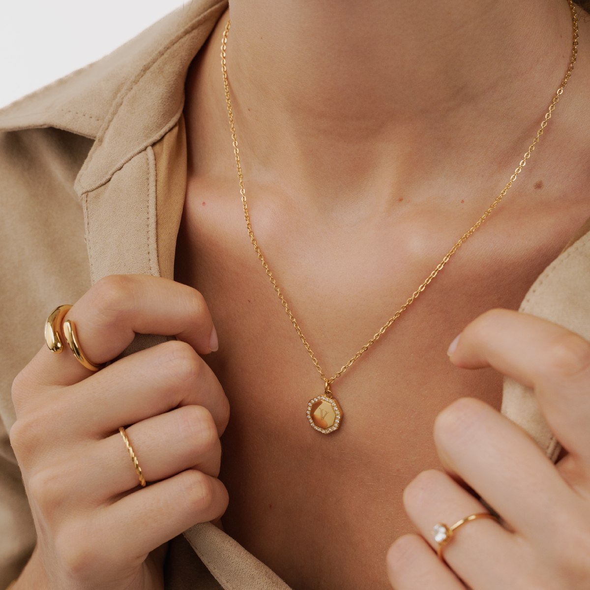 The personalization of this elegant octagon-shaped pendant is unique, making it even more meaningful by engraving your initial or the initial of someone special to you.