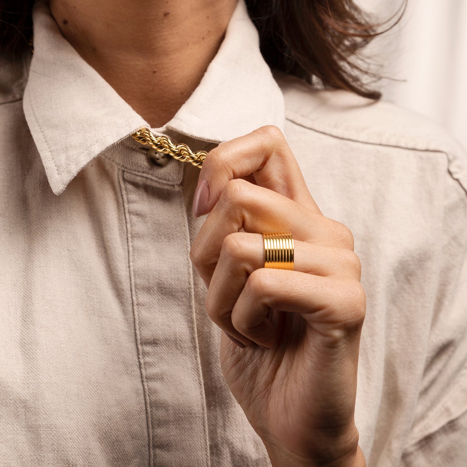 Our Valerie Ring, dipped in 18k gold, feels lightweight on your hands yet delivers a bold and elegant look. With smooth lines it is a fabulous statement ring to wear on the daily.