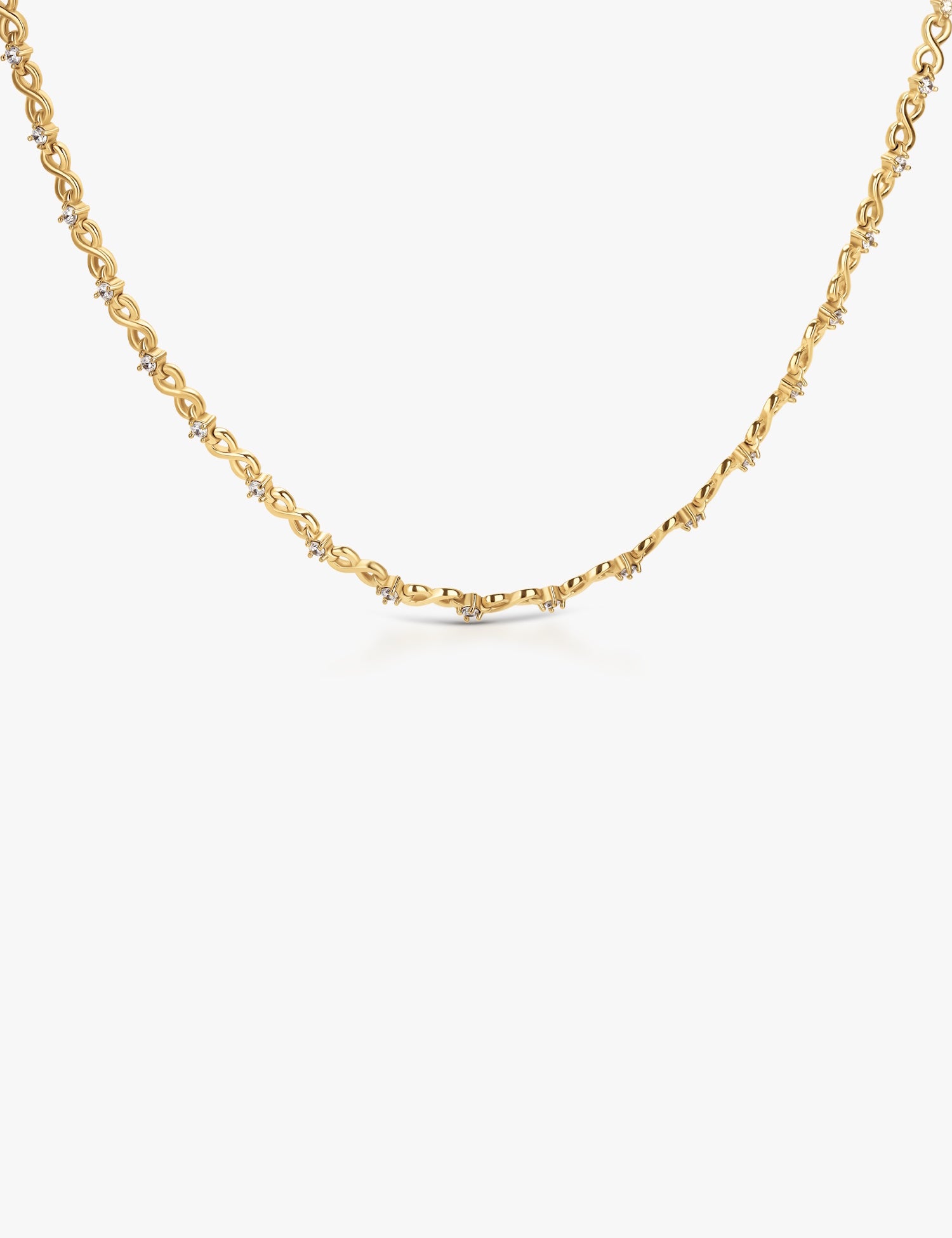 Un collar escultural inspirado en el símbolo del infinito. Sus eslabones fluidos, adornados con pequeños puntos de luz, representan la continuidad y la eternidad en cada detalle. Una pieza versátil que combina delicadeza y significado, diseñada para acompañar cada momento.